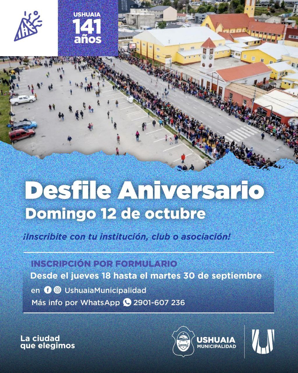 La Municipalidad de Ushuaia invita a instituciones, clubes y asociaciones de la ciudad a participar del tradicional desfile cívico militar que se realizará el próximo domingo 12 de octubre, en el marco de la conmemoración del 141° aniversario de Ushuaia.