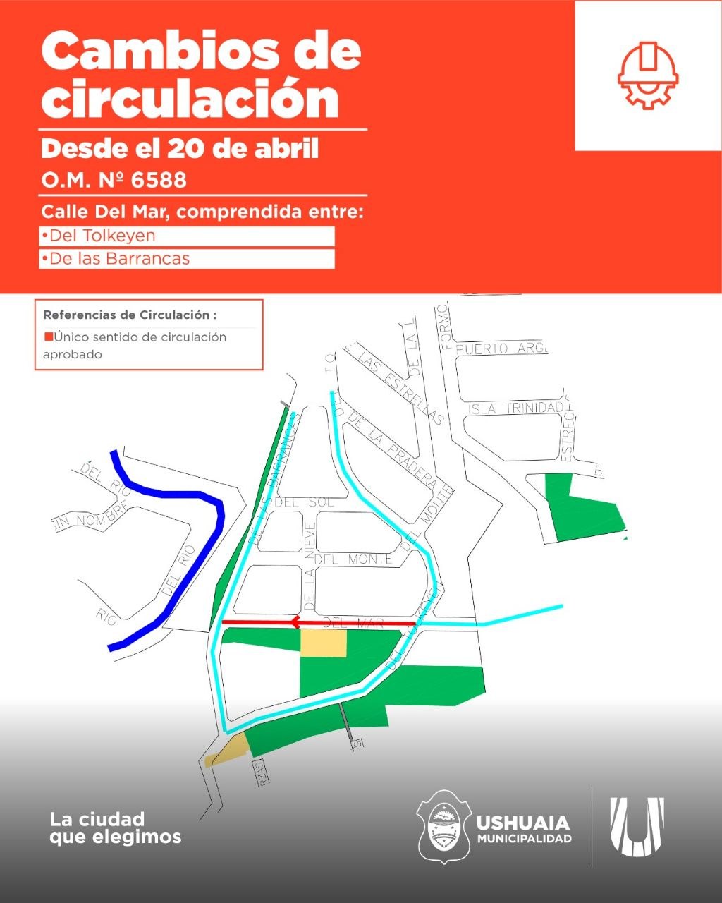 En Ushuaia, desde la Municipalidad confirmaron que a partir del 20 de abril comenzarán a regir modificaciones en la circulación vehicular establecidas en una ordenanza. Se trata del tramo de la calle Del Mar comprendido entre Del Tolkeyen y De las Barrancas. La medida apunta a reorganizar el tránsito en una zona con movimiento constante, favoreciendo una circulación más ordenada y segura.