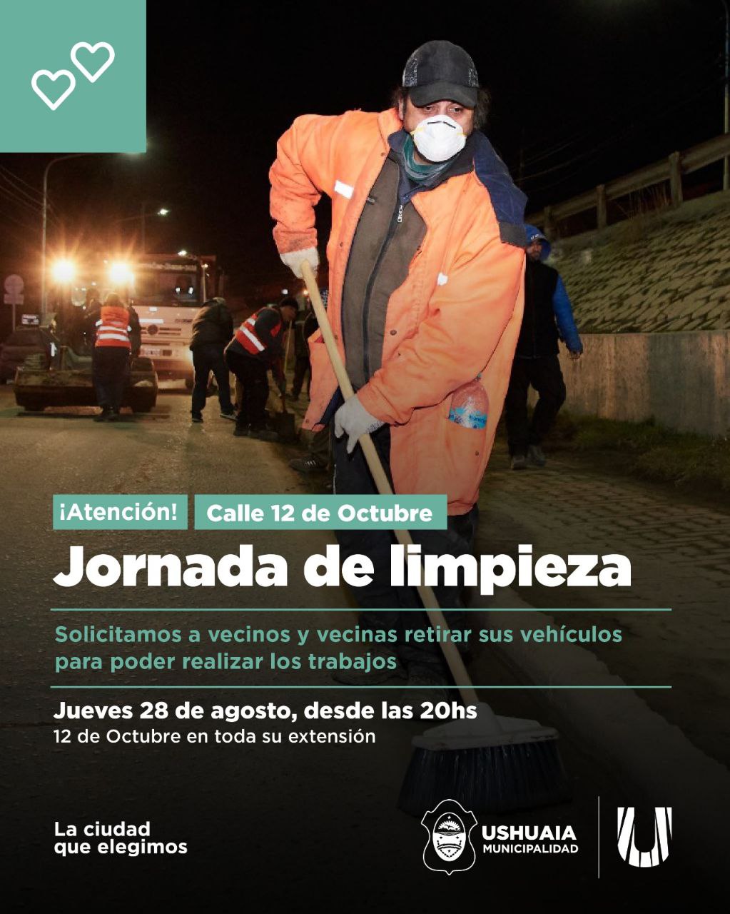 La Municipalidad de Ushuaia dará continuidad esta semana a los operativos de limpieza, con trabajos programados para el jueves 28 de agosto en la calle 12 de Octubre y el viernes 29 en la calle Fuegia Basket, ambos desde las 20 horas y en toda su extensión.