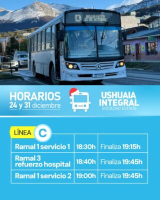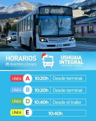 La empresa de colectivos Ushuaia Integral Sociedad del Estado (UISE) recuerda a los vecinos que el Transporte Público de Colectivos tendrá horario reducido durante el 31 de diciembre y 1 de enero. Este miércoles los recorridos y la frecuencia será la habitual, teniendo en cuenta que la última salida será desde la Rotonda del Indio a las 18.10 horas para las Líneas A y B, finalizando 20 horas.