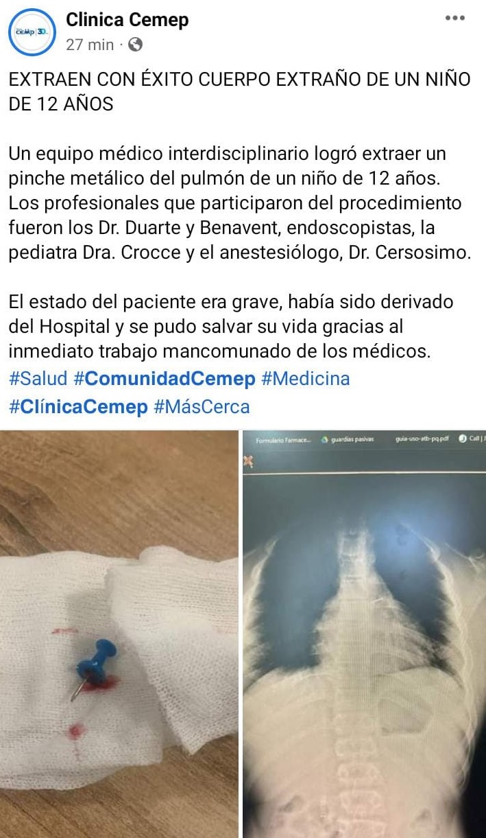 Si bien era una operación de riesgo, desde el equipo médico del Cemep lograron con éxito retirar un cuerpo extraño alojado en el bronquio de un menor de 12 años. Por otro lado, reiteraron la atención a los padres sobre los niños que juegan con objetos peligrosos.