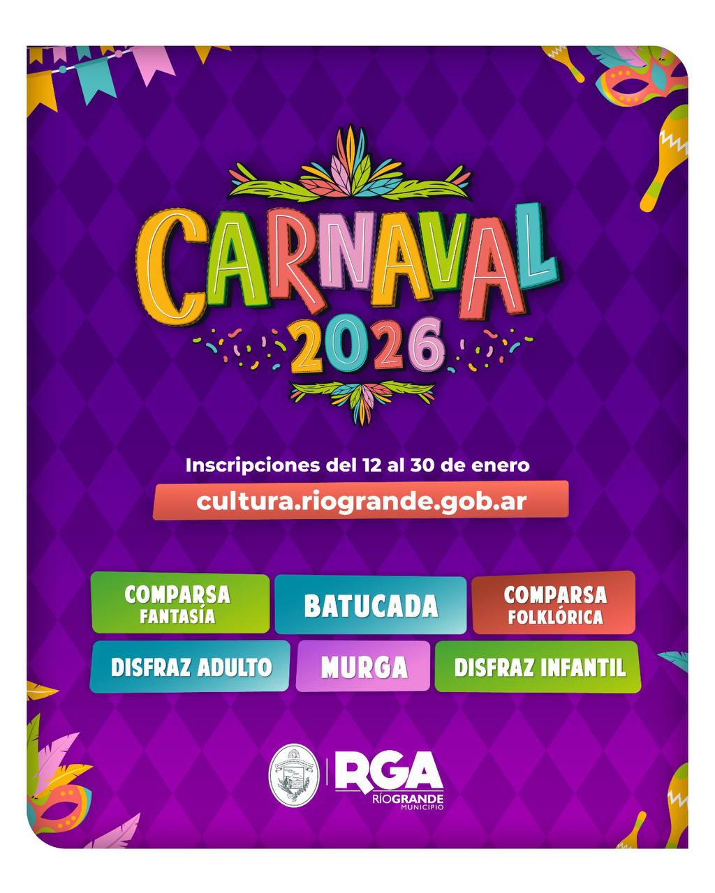 El Municipio de Río Grande invita a las agrupaciones de murgas, comparsas y batucadas de toda la provincia a sumarse y participar del Carnaval 2026 de la ciudad. Por ello, quienes estén interesados en ser parte deben hacerlo de manera online en el sitio web: https://cultura.riogrande.gob.ar/. Cabe mencionar que las inscripciones permanecerán abiertas hasta el 30 de enero.
