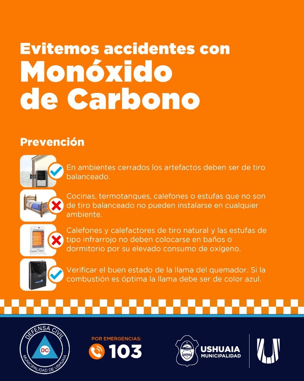 La Municipalidad de Ushuaia, a través de la Dirección de Defensa Civil, recuerda a los vecinos y vecinas la importancia de realizar mantenimiento periódico de los artefactos a gas y asegurar una ventilación adecuada en los ambientes, con el fin de evitar intoxicaciones por monóxido de carbono durante el invierno.