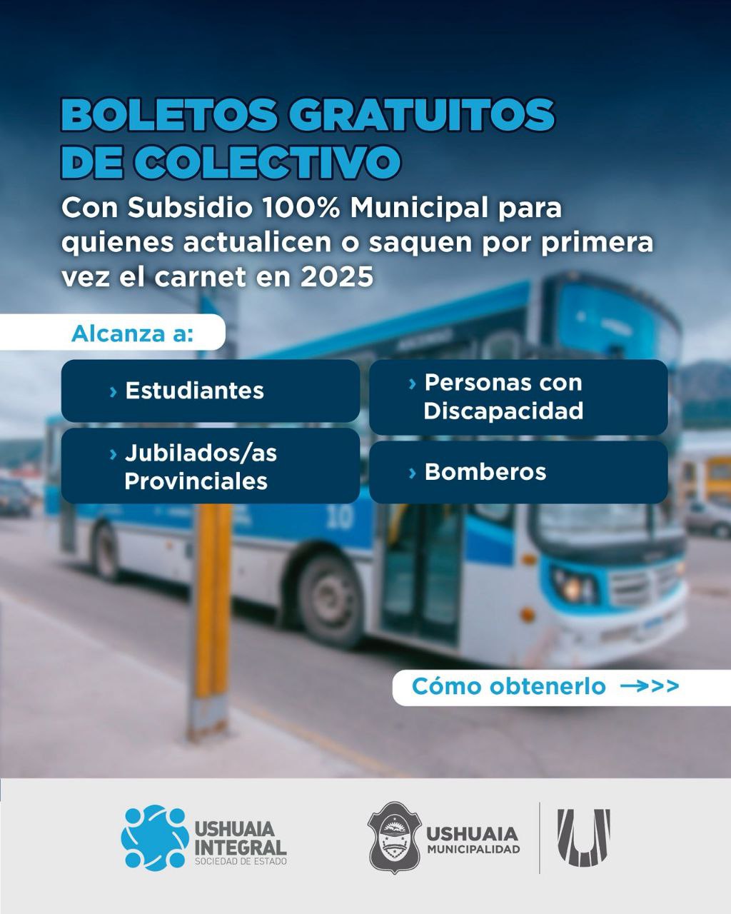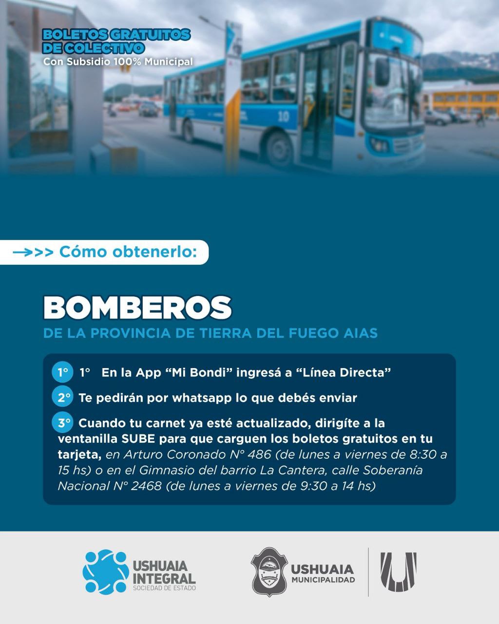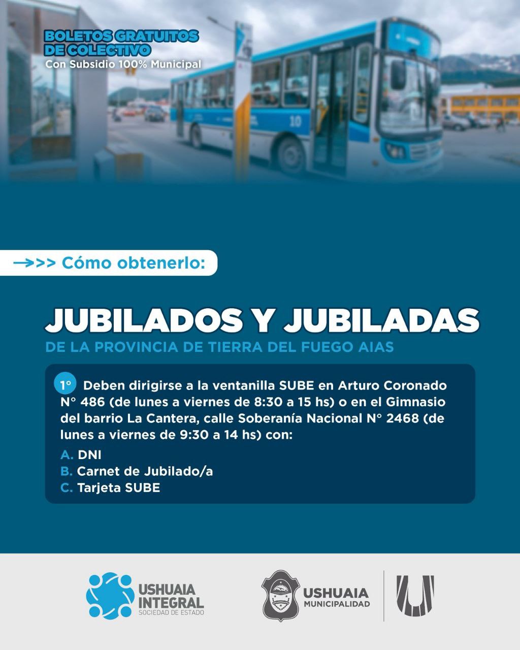 La Municipalidad de Ushuaia informa a vecinos y vecinas que a partir del 2 de marzo se podrá gestionar el acceso al boleto gratuito estudiantil del servicio de transporte público de colectivos que brinda la empresa Ushuaia Integral Sociedad del Estado (UISE). Alcanza a estudiantes de los niveles primario, secundario, terciario y universitario. Se trata de un subsidio del 100% del valor del boleto tanto para quienes renueven el beneficio como para quienes tramiten el carnet correspondiente por primera vez.