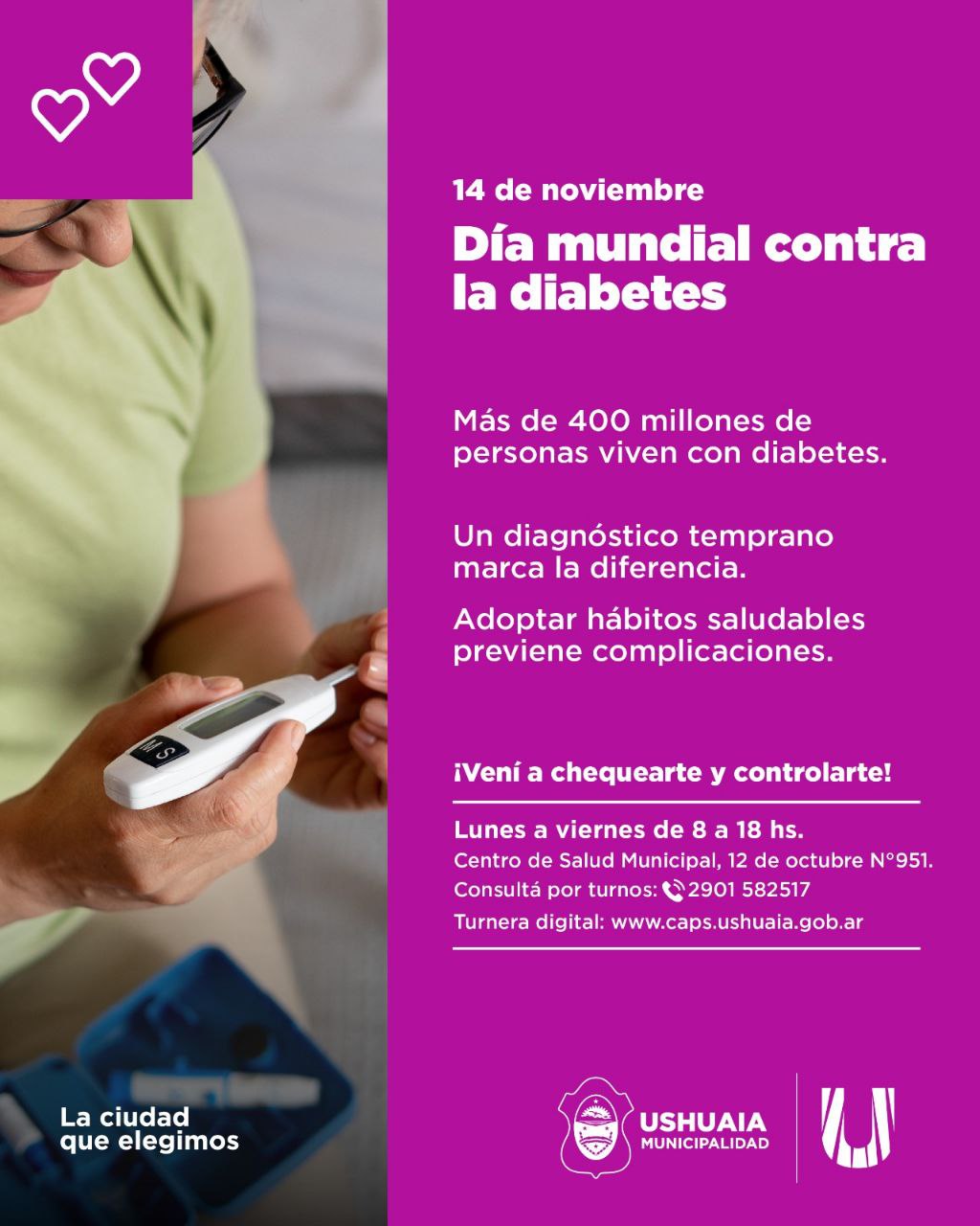 En el marco del Día Mundial contra la Diabetes, la Municipalidad de Ushuaia, a través de la Secretaría de Políticas Sociales, Sanitarias y Derechos Humanos, invita a la comunidad a realizar controles y consultas preventivas en el Centro de Salud Municipal, ubicado en 12 de Octubre N°951.