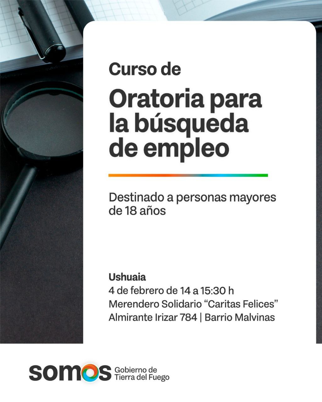 El Ministerio de Trabajo y Empleo de la provincia informa que se encuentran abiertas las inscripciones para dos propuestas de formación gratuita dirigidas a la comunidad: el curso de “Oratoria para la Búsqueda de Empleo” y el taller “La comunicación como herramienta de intervención en conflictos laborales”. Ambas actividades se desarrollarán el miércoles 4 de febrero en el Merendero Solidario “Caritas Felices”, ubicado en la calle Almirante Irízar 784, del Barrio Malvinas de Ushuaia.