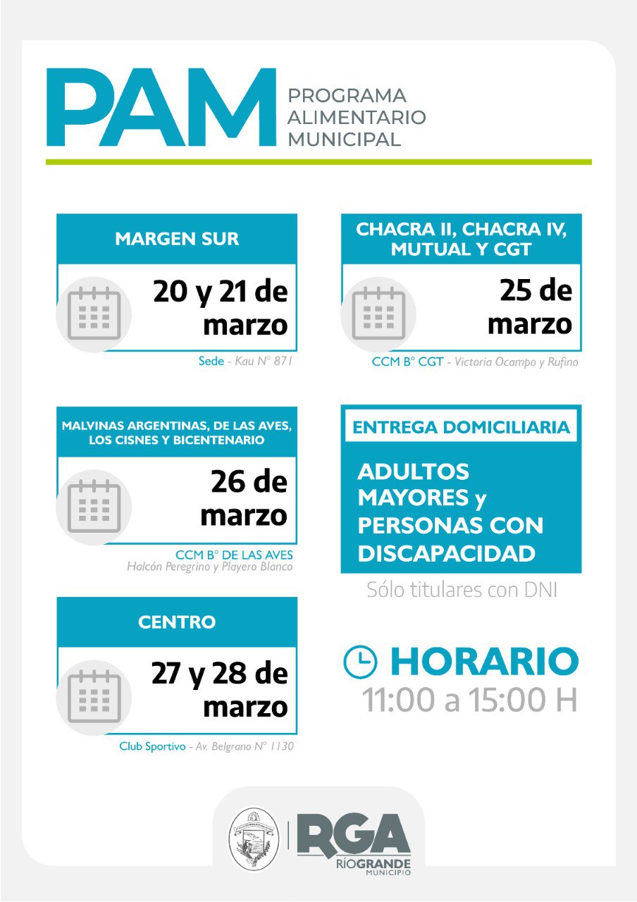 El Municipio de Río Grande informa a las y los beneficiarios del “Programa Alimentario Municipal” que, este jueves 20 de marzo, comenzará la distribución de los módulos a las familias de diferentes puntos de la ciudad. La entrega es únicamente a los y las titulares, de forma presencial, quienes deben acercarse con el DNI, entre las 11 y las 15 horas.