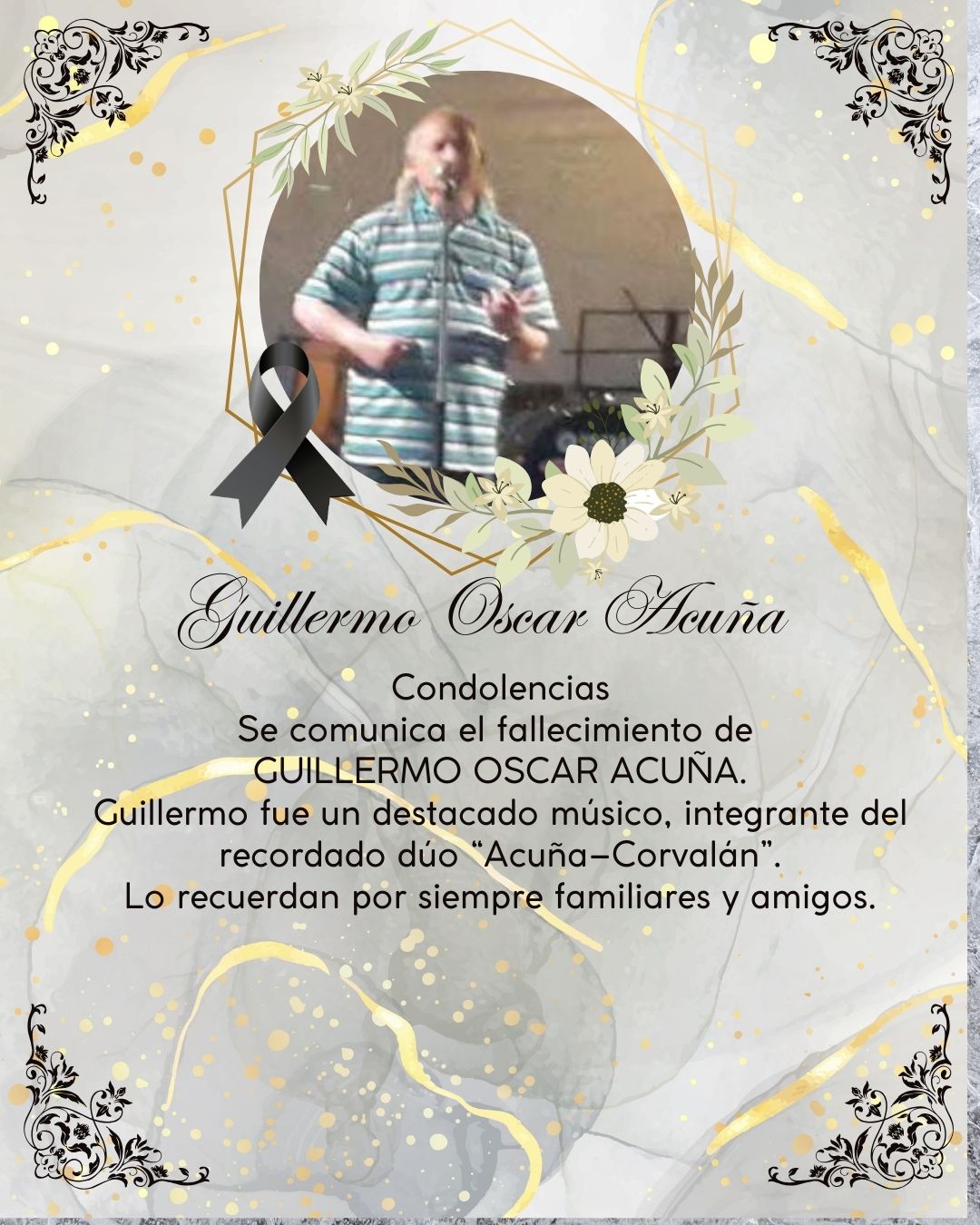Guillermo Oscar Acuña 19/12/2025 Condolencias Se comunica el fallecimiento de GUILLERMO OSCAR ACUÑA. Guillermo fue un destacado músico, integrante del recordado dúo “Acuña–Corvalán”. Lo recuerdan por siempre familiares y amigos.