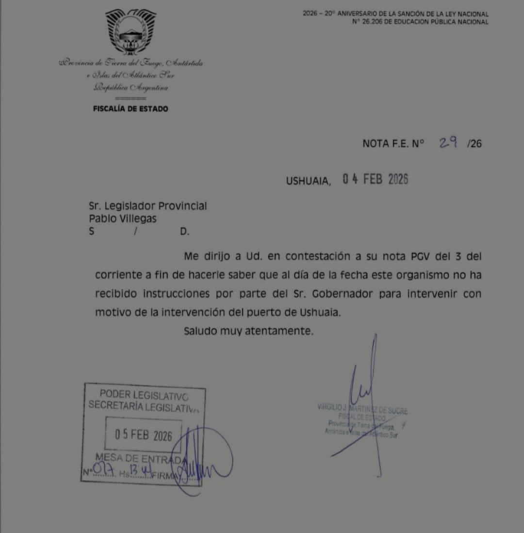 “El Fiscal de Estado me responde que no ha recibido instrucciones del Sr. Gobernador para intervenir respecto a la intervención del Puerto de Ushuaia. A resultas de dicha respuesta —que sorprende a esta altura de los acontecimientos— en el día de mañana presentaré un proyecto de Resolución para que la Legislatura lo instruya a proceder judicialmente en defensa del patrimonio de Tierra del Fuego”, señaló Villegas.