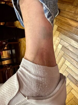 La lesión fue constatada por el Dr. Gustavo Apreda, médico del Senado, quien describió un “hematoma a nivel de zona superior del tobillo derecho de 5 x 3 cm”. La senadora fueguina también presentó dolores internos en su brazo derecho.