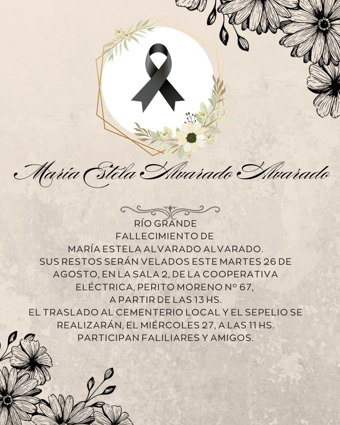 Sus restos serán velados este martes 26 de agosto, en la sala 2, de la Cooperativa Eléctrica, Perito Moreno Nº 67, a partir de las 13 Hs.
