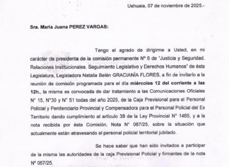 El suboficial mayor (R) Alfredo Gatti, difundió una invitación formal dirigida a todos los retirados y pensionados de origen territorial, para acompañar la interpelación al Directorio de la Caja Compensadora, convocada por la Comisión de Seguridad de la Legislatura Provincial. Será este miércoles 12 en horas del mediodía en los bloques legislativos, de Ushuiaia.
