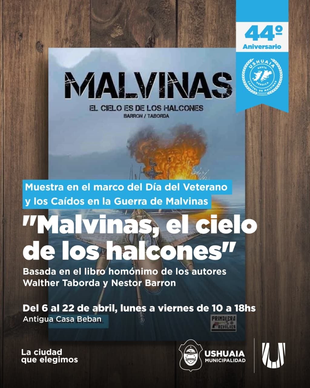 La Secretaría de Políticas Ambientales, Culturales y Educativas de la Municipalidad de Ushuaia, en el marco del 44° Aniversario del Día del Veterano y de los Caídos en la Guerra de Malvinas, presentará en la Antigua Casa Beban la muestra “Malvinas, el cielo es de los halcones”.