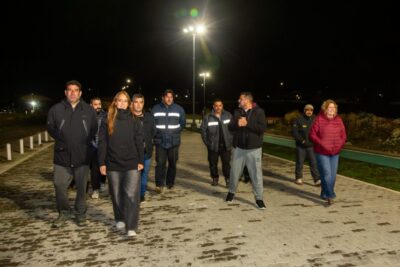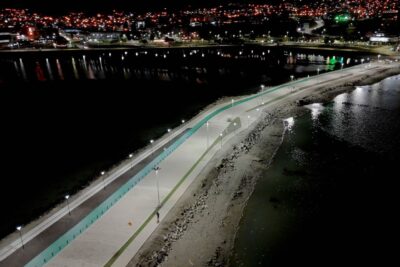 En el marco de los trabajos finales de la obra de remodelación y puesta en valor de la pasarela Luis Pedro Fique, se realizó la primera prueba del sistema de alumbrado del emblemático espacio de Ushuaia. Informaron que “se probaron tanto las luminarias altas como ornamentales del paseo”.