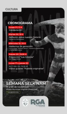 La Semana Selk’nam comenzará este lunes 17, a las 11 horas, con el acto de inauguración. El martes 18, a las 19 horas, se realizará la charla “Reflexión sobre nuestra historia”, a cargo de Margarita Maldonado, quien compartirá su mirada sobre la memoria y la presencia del pueblo Selk’nam en la actualidad.