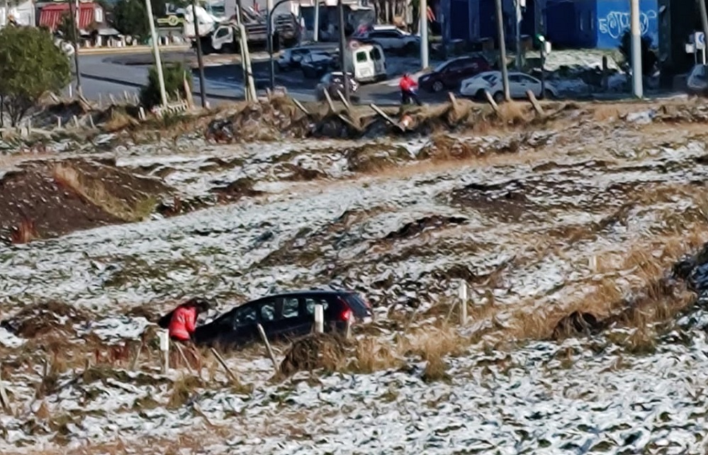 Uno de los coches se despistó y terminó su marcha en el sector bajo del descampado frente al numeral 800 de Irigoyen. Era un Honda modelo Fit, ocupado por la conductora María Del Rosario Sostaguta (69), quien estaba acompañada por Jorge Eduardo Creser Pereyra (72).