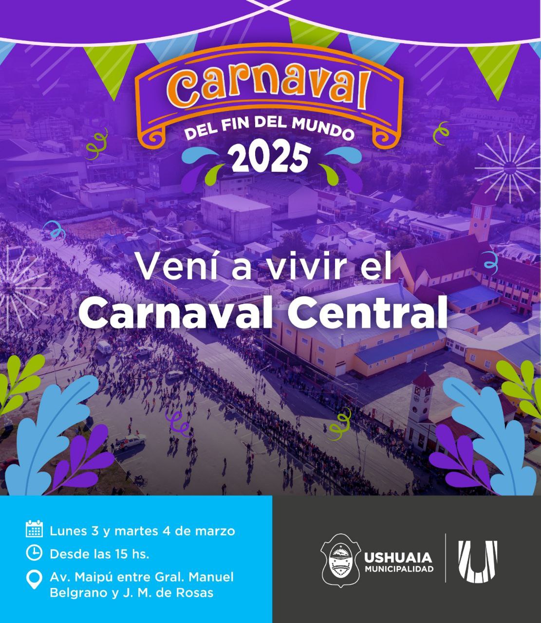 En el marco del festejo popular “Carnaval del Fin del Mundo 2025”, la Secretaría de Cultura y Educación de la Municipalidad de Ushuaia invita a vecinos y vecinas a participar del “Carnaval Central” a realizarse el día lunes 3 de marzo a partir de las 15:00 horas en la Avenida Maipú.