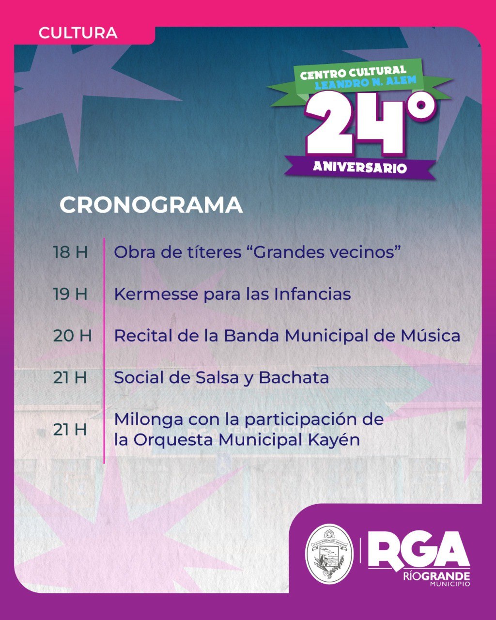 Este emblemático espacio de Río Grande celebrará un año más de vida como promotor de la cultura, la creatividad y la libertad de expresión. Es el lugar elegido por los artistas para potenciar su talento a través de los distintos talleres. La Subsecretaría de Cultura invita a la comunidad a festejar los 24 años del Centro Cultural “Leandro N. Alem” este viernes 19 de septiembre, a partir de las 18, en Belgrano y Alberdi.