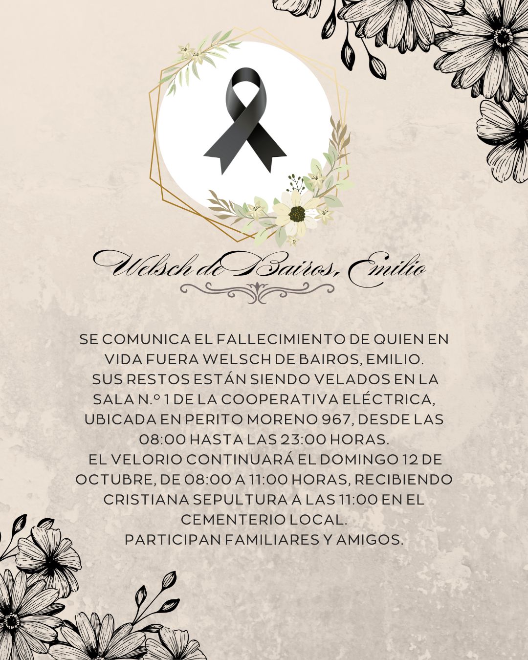 Se comunica el fallecimiento de quien en vida fuera WELSCH DE BAIROS, EMILIO.
